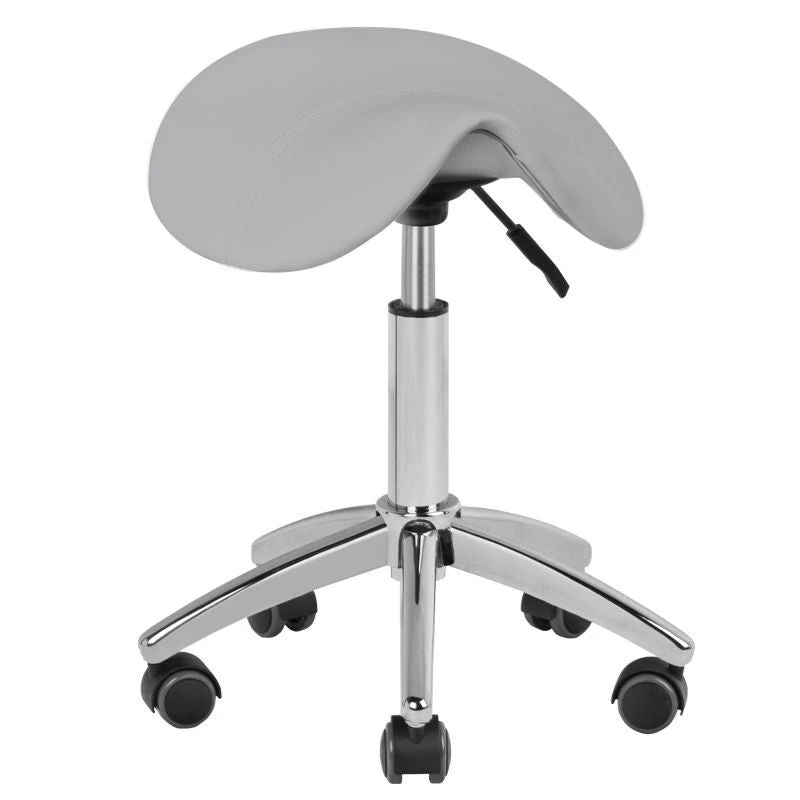 comfortable, stable cosmetic stool without a back, with a profiled seat, on a five-star base with rubberized wheels, gray color, necessary piece of furniture in a beauty salon.