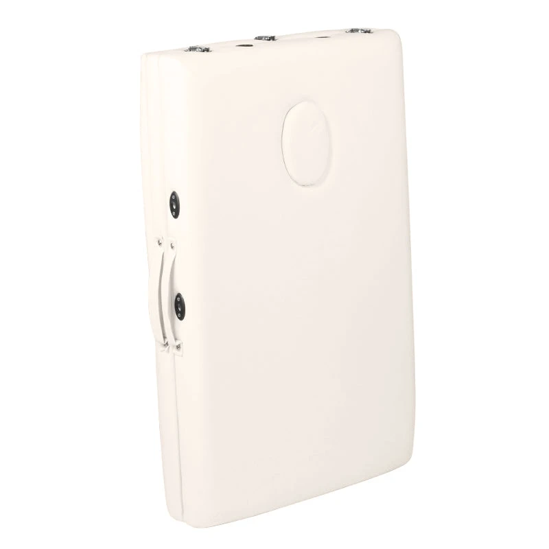 The ActivFizjo Aluminum Folding Massage Table Comfort 2 Segments in elegant cream and silver is crafted for therapists who value both functionality and style. This massage table combines a robust wooden frame with lightweight aluminium legs, offering a stable yet easily transportable solution. The thick foam cushioning, wrapped in high-quality eco-leather, ensures a comfortable experience for clients, while being easy to clean and maintain for long-term use.