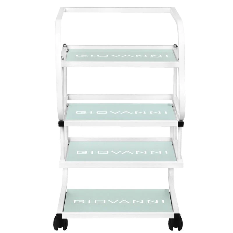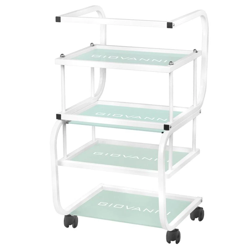 aesthetic table for a cosmetic device, made of metal and glass, with wheels. has four glass shelves.