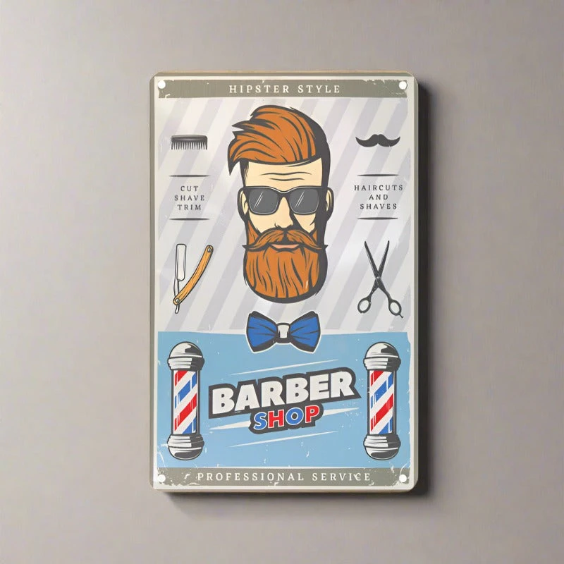 Transform your barber shop into a stylish and trendy space with our Decorative Plaque for Barber Shop B057 ‘Barber Shop’. Crafted from thin aluminium sheets using advanced sublimation techniques, this plaque features vibrant graphics guaranteed to retain colour over time without fading in the light or sun. The specially embossed inscriptions add a unique visual effect, making it the perfect decoration for loft rooms, barbershops, tattoo studios, and more.