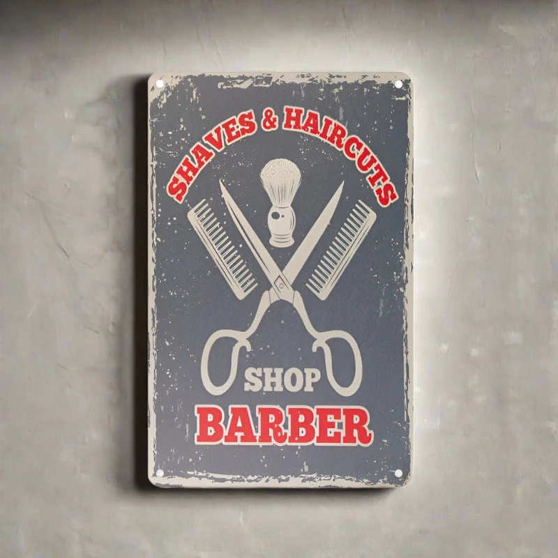 Upgrade your barber shop decor with our stylish Decorative Plaque for Barber Shop B064 ‘Shaves & Haircuts’. Crafted from a thin aluminium sheet, this plaque features graphics applied using advanced sublimation methods for a sleek and modern look.