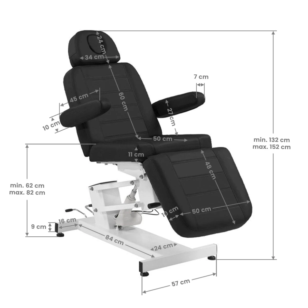 cosmetic chair with up-down adjustment by means of a remote control. two pedals in the rear part of the base enable smooth adjustment of the backrest and cradle. a comfortable armchair, folding up to 180 degrees, can be successfully used as a daybed. a blind hole in the headrest that allows you to take a comfortable position during treatments, among others massage. The seat is covered with high-quality and easy-care eco-leather. Manually adjustable footrest. the possibility of raising the armrests upwards, which makes it easier for the customer to take a seat on the seat.