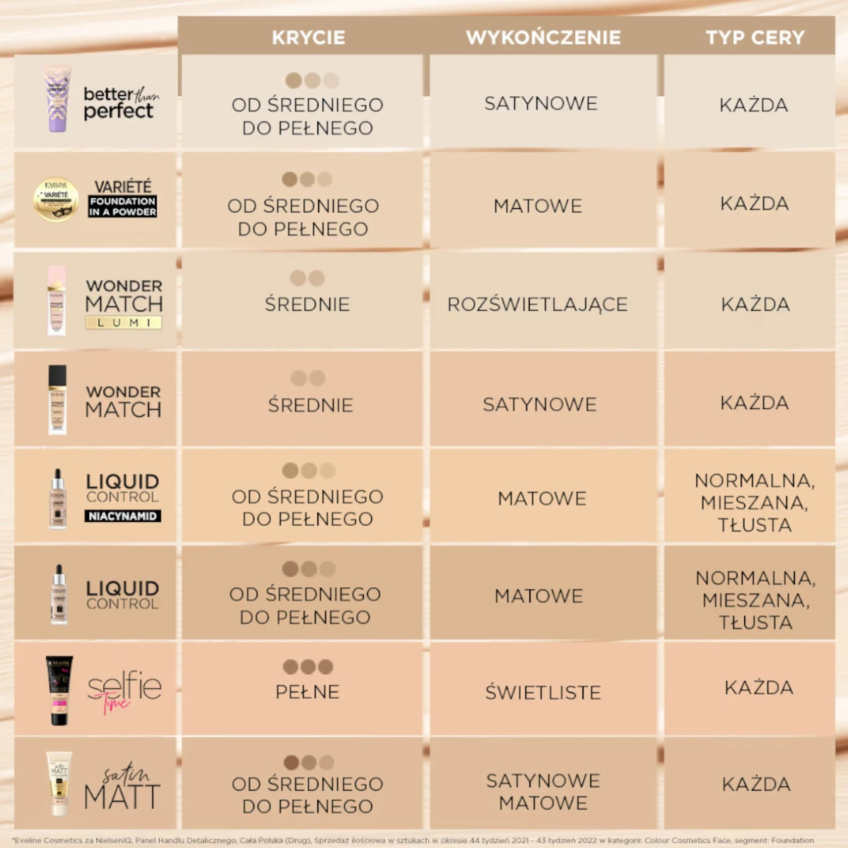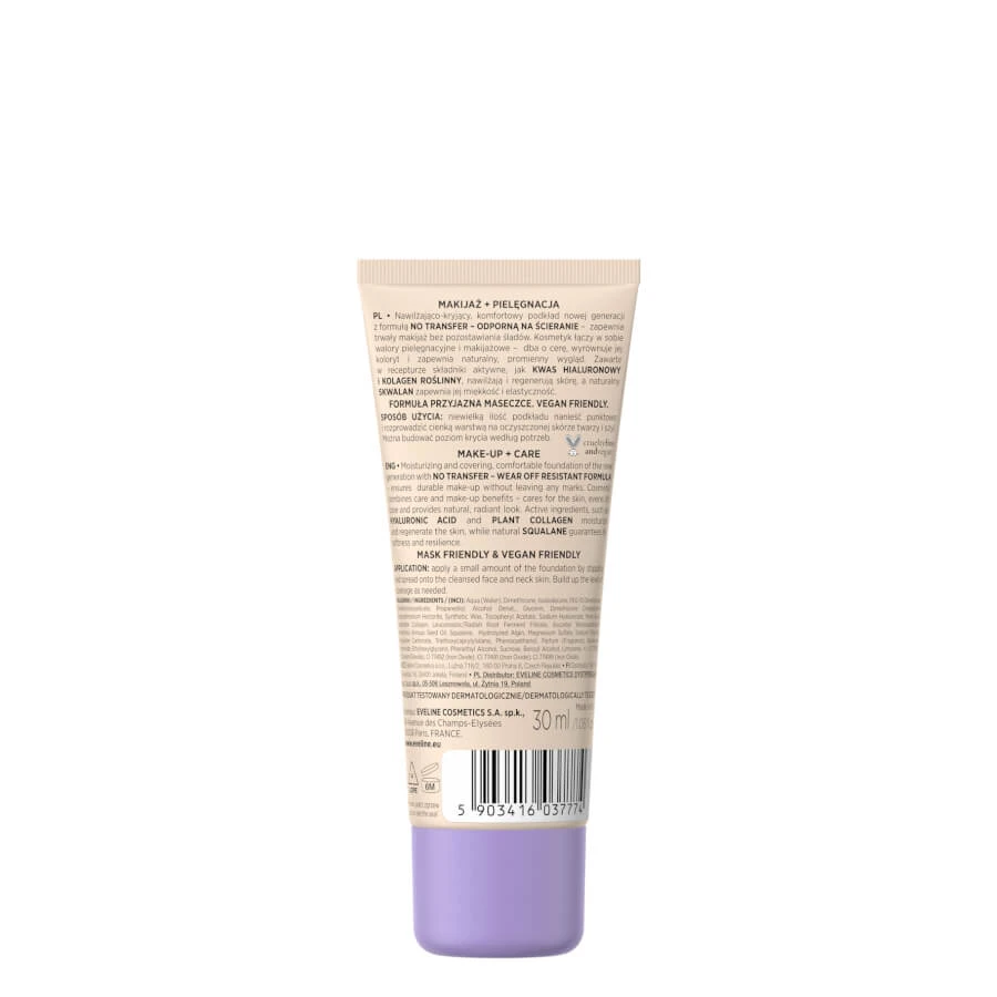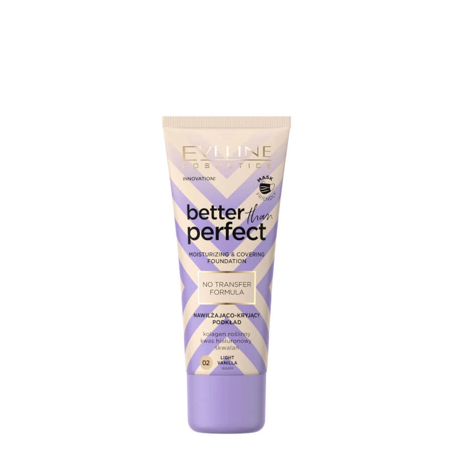 Moisturizing covering foundation from Eveline Cosmetics is a combination of makeup and care. Better Than Perfect provides perfect hydration and a radiant, natural look of the skin. Wearing a protective mask has become our everyday life. The skin has not got used to the new conditions yet, and these require a special way of face care and cosmetics that ensure makeup qualities without creating another mask. The foundation contains innovative active ingredients, such as hyaluronic acid, vegetable collagen, which deeply moisturize and regenerate the skin, and the natural squalane ensures its softness and elasticity.