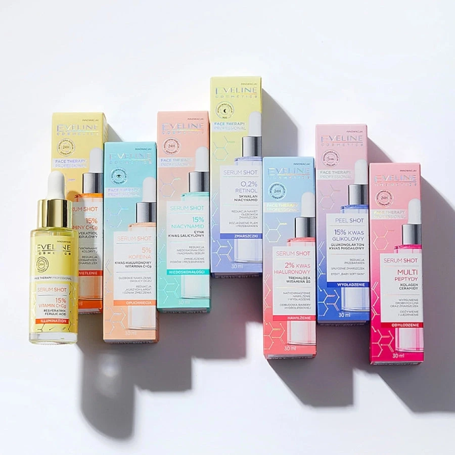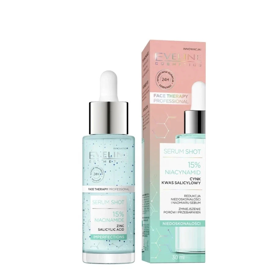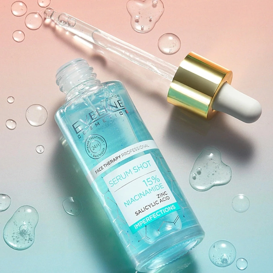The treatment with 15% niacinamide from Eveline Cosmetics from the Serum Shot series effectively cares for oily, problematic and acne skin. The unique active ingredients contained in the serum improve the texture of the skin, reduce the secretion of sebum and restore the freshness of the skin and evens out its color. The serum soothes the symptoms of acne and smoothes. It has a vegan formula.