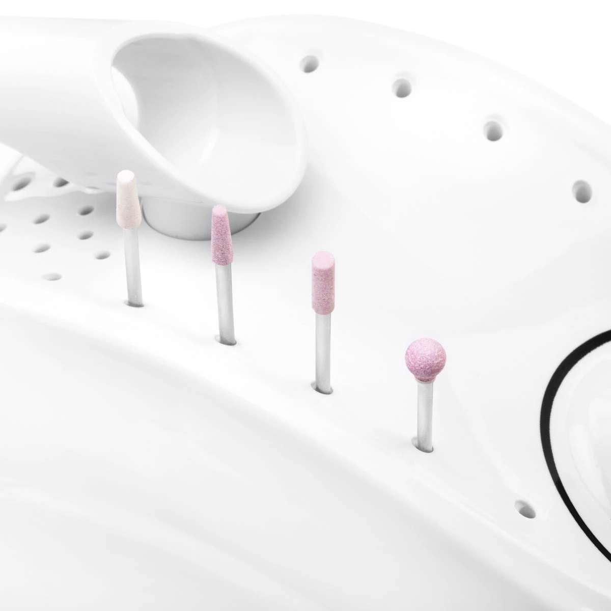 The handpiece of this nail drill machine is really solid and reaches a maximum of 35,000 revolutions per minute. You can control it via the box as well as via the attached foot drive. Reverse rotation of the handpiece with one summary, no stopping necessary. You can put the handpiece onto the holder that will be attached to the control box. The special construction of the box allows you to insert bits into the holes so that they are available at hand.