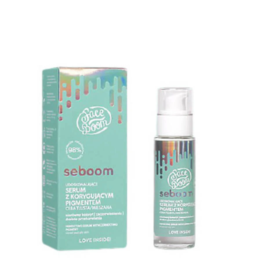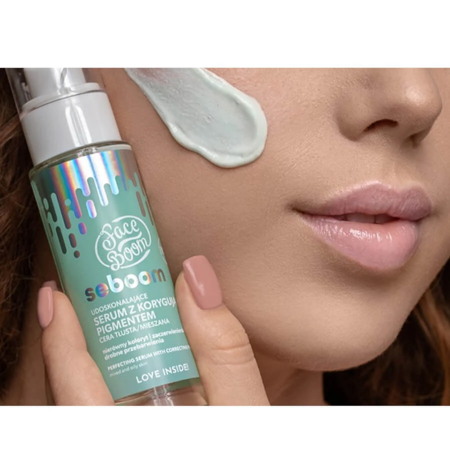 The perfecting serum with correcting pigment from the seboom series restores oily and combined skin’s natural balance and freshness. The natural serum makes redness on the skin less visible, and even uneven skin tone. It has a light formula, green in colour, which changes into a delicate beige shade in contact with the skin.