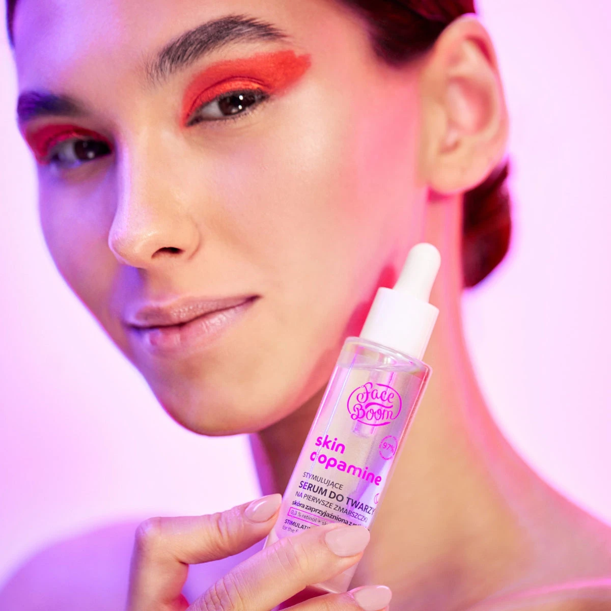 Face Boom Skin Dopamine Stimulating Anti-Wrinkle Serum with 0.3% Retinol is a vegan-friendly stimulating serum formulated for facial skin with its first wrinkles. The natural formula contains vitamin A in 0.3% retinol, perfect for those starting with this powerful ingredient. This helps reduce wrinkles, smooth away fine lines and support the fight against imperfections and blackheads.
