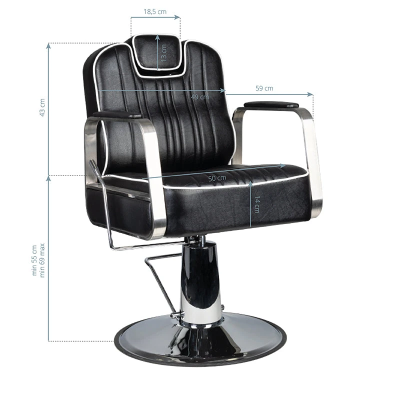 new in our offer – matteo barber chair. is a modern, perfectly finished piece of furniture that gives the customer of the salon the maximum feeling of comfort during the treatments performed. apart from the up-down adjustment, the chair has a reclining backrest. despite its small dimensions, it is possible to place the client in a convenient, reclining position. the comfortable seat is covered with high-quality eco-leather. wide, chrome base guarantees the stability of the furniture during operation. an additional advantage is the easy adjustment of the headrest. a piece of furniture in black color.