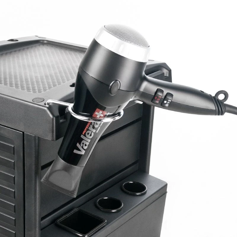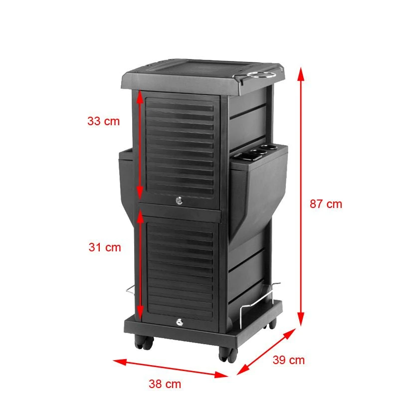black hairdressing assistant with 2 lockable key shutters, 4 litter boxes and 15 compartments for hairdressing assortment. stable construction will ensure long-term use. table mounted on wheels, thanks to which the tools will always be at hand.Â
