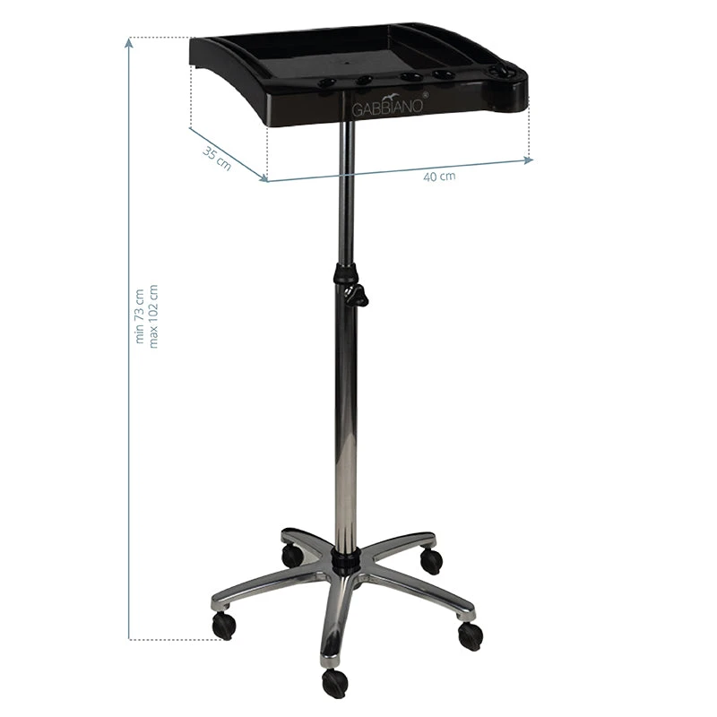 Black hairdressing assistant. Stable construction will ensure long-term use. Table mounted on wheels, thanks to which the tools will always be at hand.