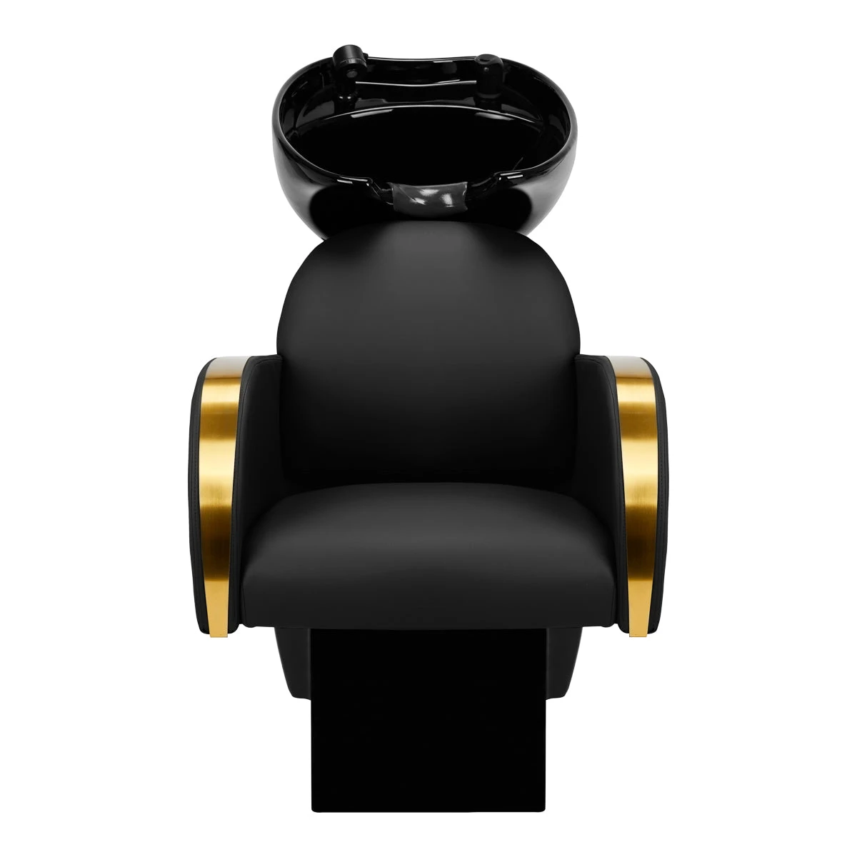 A properly profiled chair filled with durable foam ensures high comfort of use and elegant armrests allow for the correct positioning of the client’s shoulders. The backrest is placed at an optimal angle to allow you to take the right position and promote excellent spine support. Coverage in shades of black and decorative metal surfaces lacquered in gold colors give it a timeless elegance and in addition guarantees long-term durability and ease of cleaning. Distinctive hair wash unit classic finish makes it look great in almost any space. The set includes complete fittings in shades of black, including a faucet, shower head and dedicated hoses to provide a complete set of tools for work.