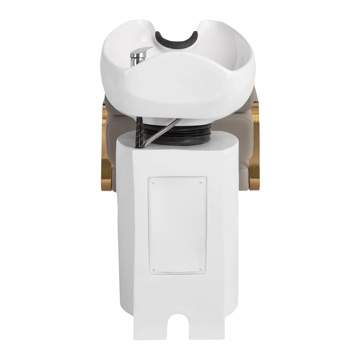 Gabbiano Porto Backwash Unit in Gold & Grey, the epitome of modern hairdressing sophistication. Designed with a fusion of functionality and Italian elegance, this backwash unit is crafted from the highest quality materials and finished to perfection. We understand the importance of client comfort during treatments, and that’s why our special design provides solid head support while washing.