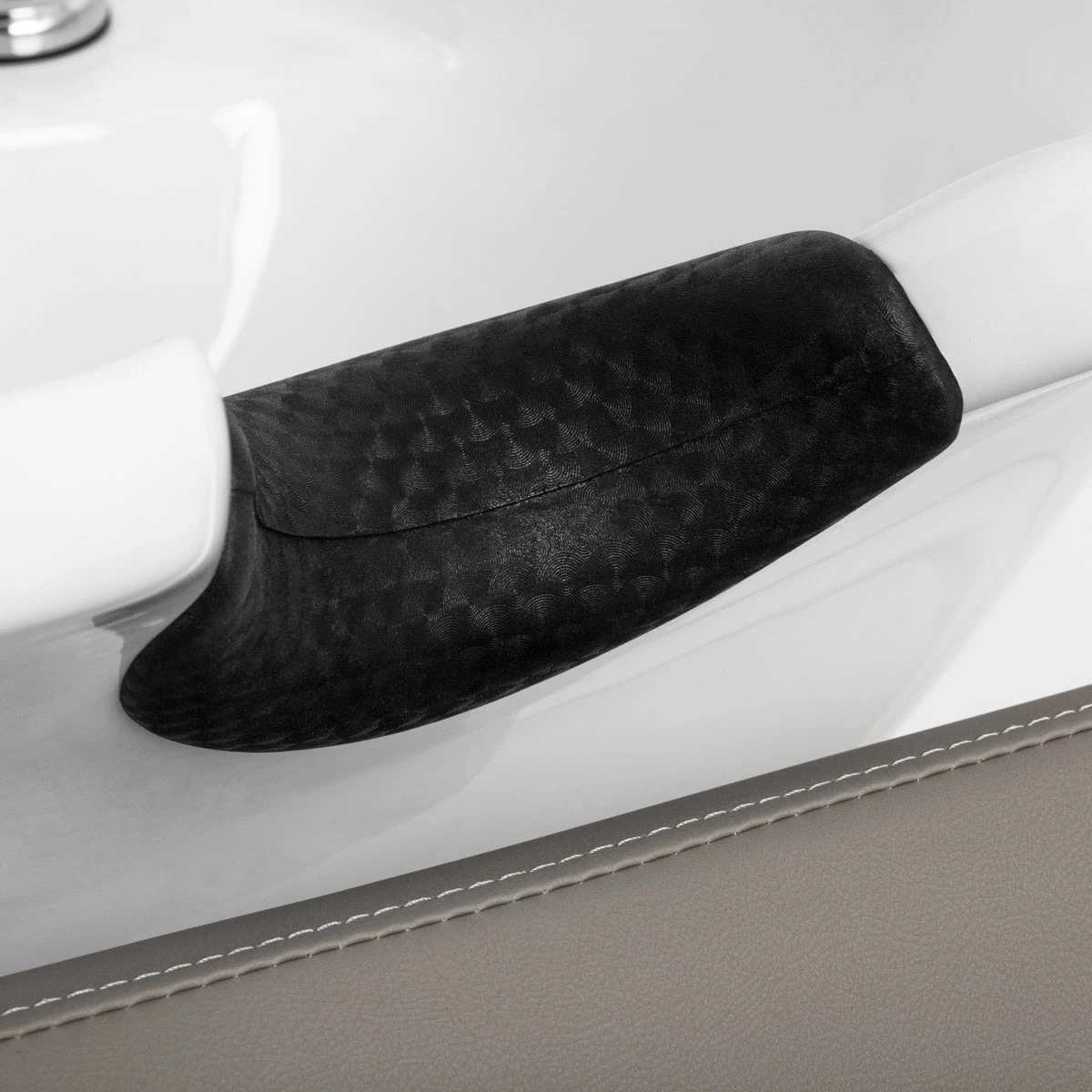 The Gabbiano Porto Backwash Unit features a soft and incredibly comfortable seat, upholstered in luxurious grey eco-leather. The sleek white ceramic bowl adds a touch of purity to the unit, while the golden armrests exude opulence. This backwash unit is the perfect addition to modern interiors, offering both practicality and style.