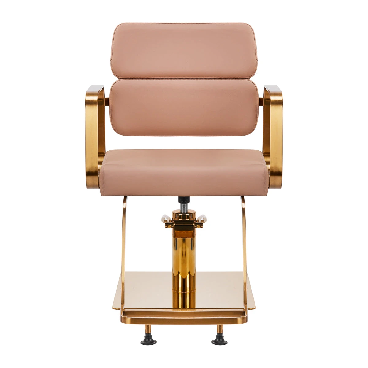The full rotation mechanism of the chair makes the hairdresser’s work more effective and comfortable. A solid, flat, square-shaped base guarantees stability during use. The matte-finished, smooth surface gives the element an elegant look and makes it easy to keep clean. A comfortable seat with foam filling ensures high comfort of use, even during many hours of treatments. Geometric, metal armrests in shades of gold allow for the correct positioning of the client’s shoulders – this means that he does not bury his head in his shoulders or slouch – which makes it much easier to perform precise treatments, including haircuts. A stylish footrest dedicated to this model provides stable support for the user’s feet.