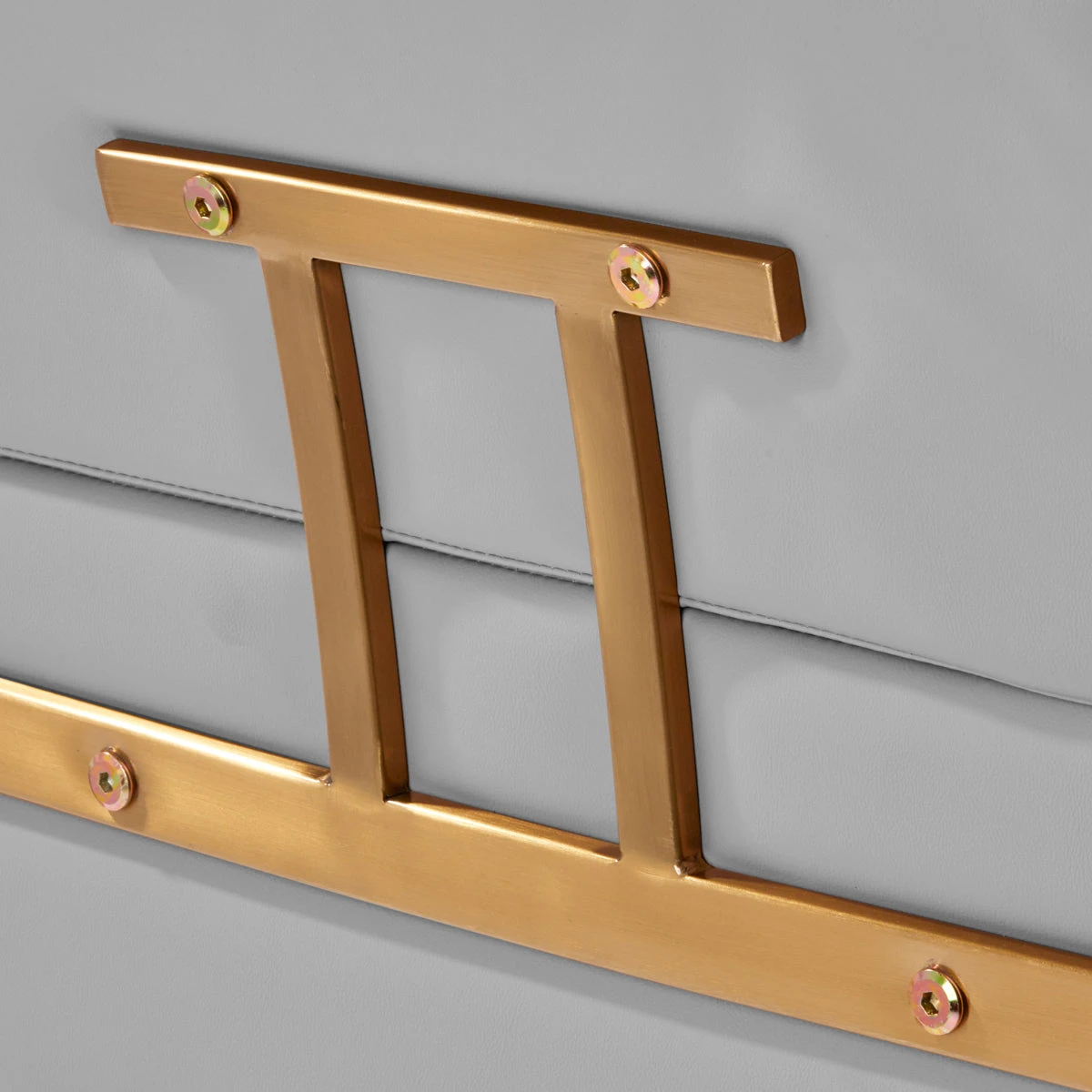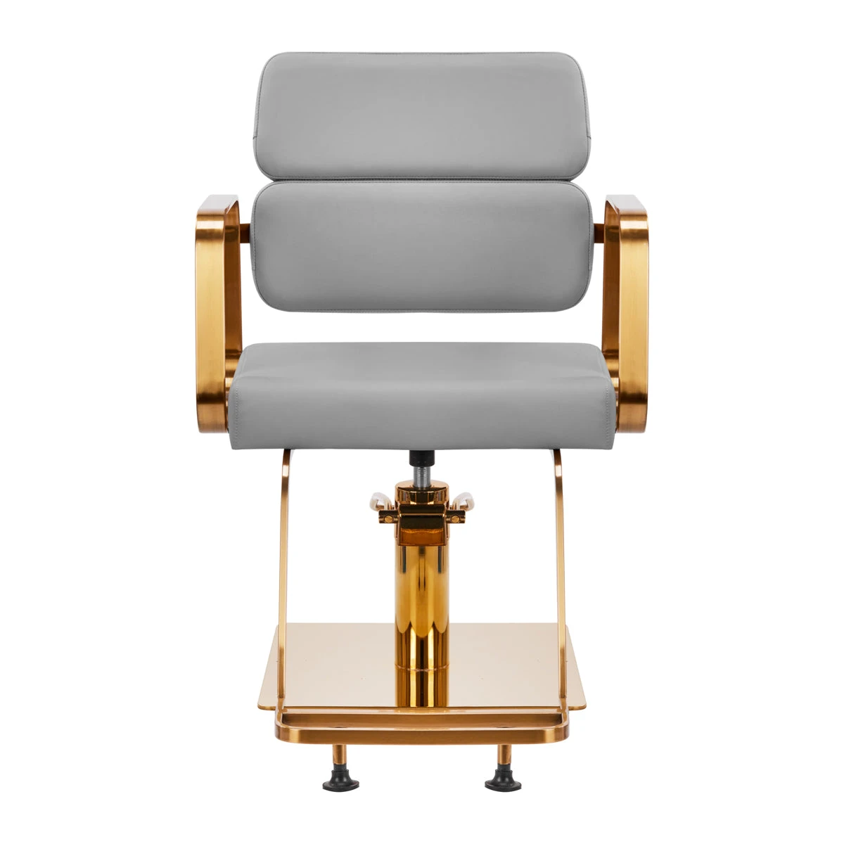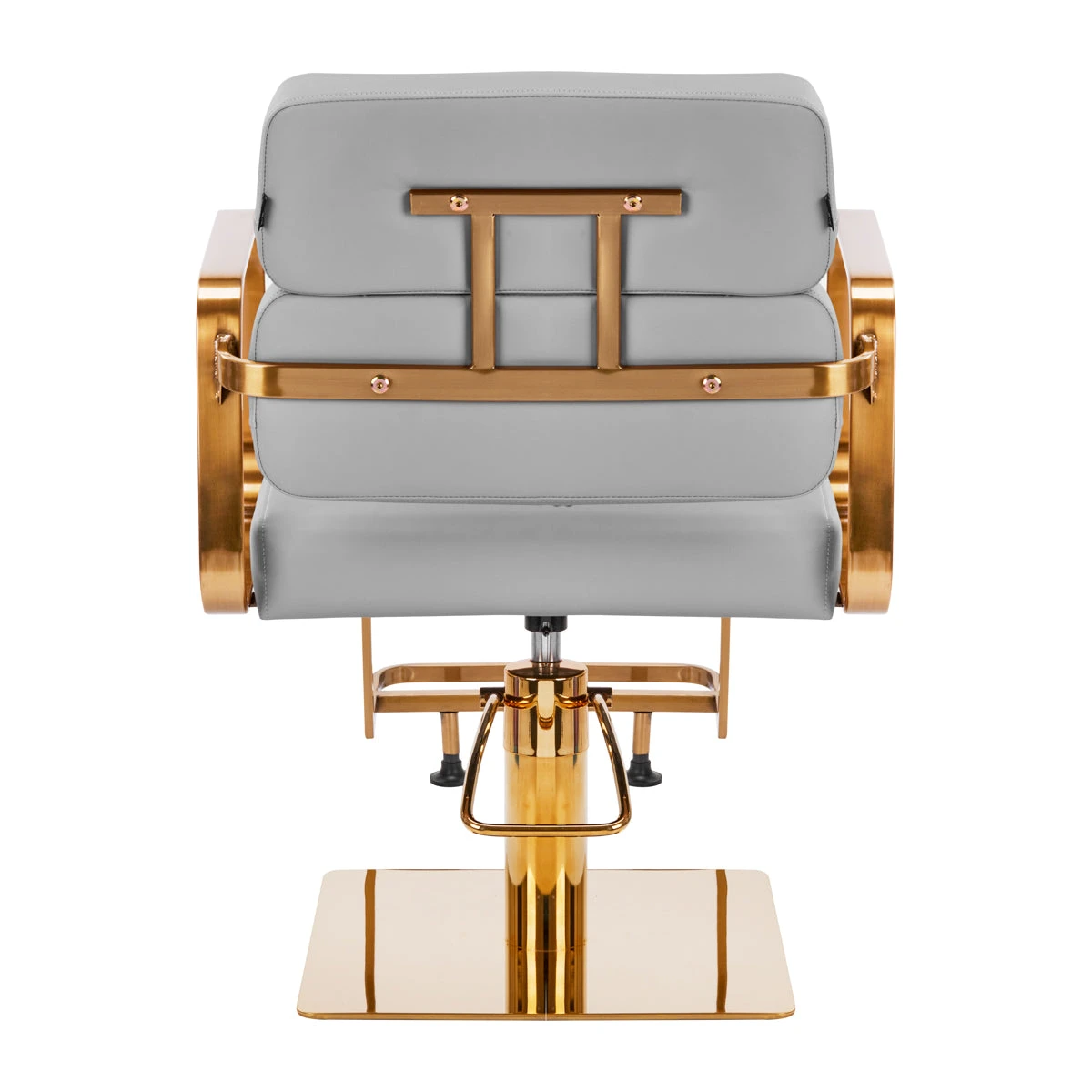 The full rotation mechanism of the chair makes the hairdresser’s work more effective and comfortable. A solid, flat, square-shaped base guarantees stability during use. The matte-finished, smooth surface gives the element an elegant look and makes it easy to keep clean. A comfortable seat with foam filling ensures high comfort of use, even during many hours of treatments. Geometric, metal armrests in shades of gold allow for the correct positioning of the client’s shoulders – this means that he does not bury his head in his shoulders or slouch – which makes it much easier to perform precise treatments, including haircuts. A stylish footrest dedicated to this model provides stable support for the user’s feet.
