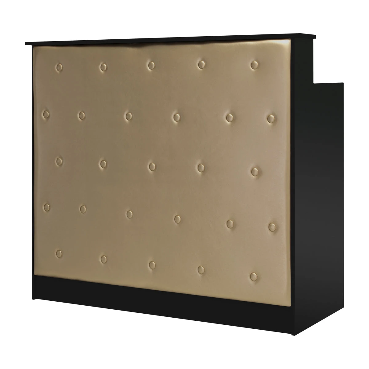This piece of furniture is made of high-quality, durable laminated board in shades of black, and the smooth surfaces are easy to keep clean – in case of contamination, just wipe them with a damp cloth. The decorative front part has been upholstered with synthetic leather in shades of gold, which gives it a stylish look, ensures durability and ease of cleaning. Decorative summarys further add elegance and uniqueness, emphasizing the character of the interior. The reception desk was carefully made, it is stable, and the materials used allow for many years of effective use.