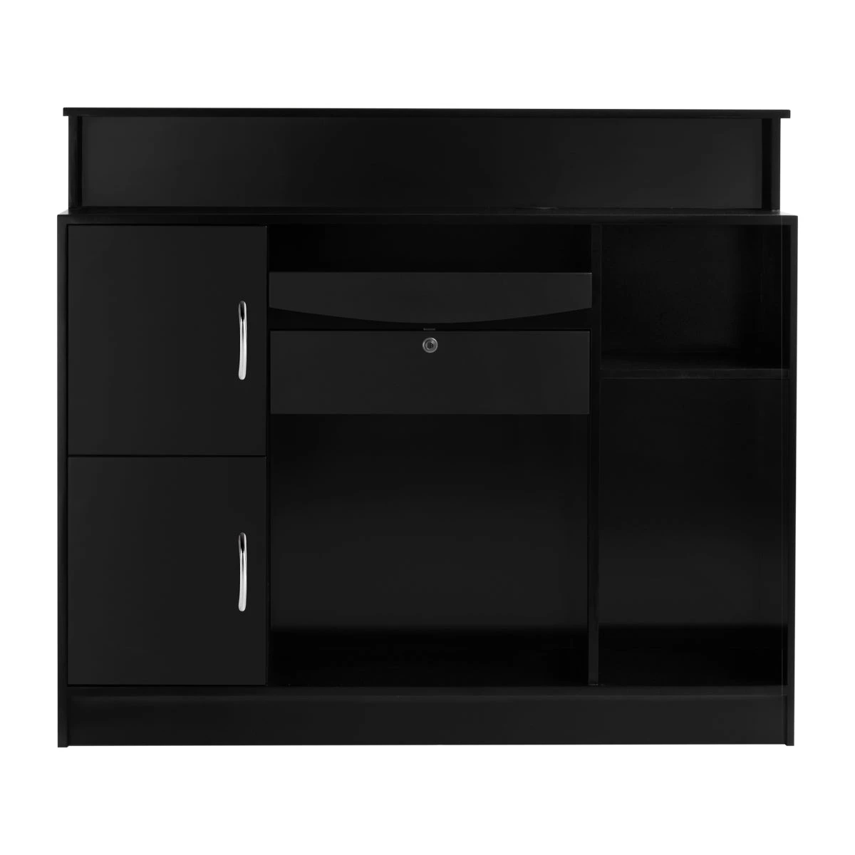 The reception desk is designed in such a way as to be the most capacious and practical piece of furniture. For convenience of use, it has been equipped with: three open shelves of various sizes, one pull-out shelf, a key drawer and two lockable cabinets with aesthetic handles in shades of silver. The spaces have been arranged in such a way as to facilitate the organization and maintenance of order in the place where all important documents are stored.