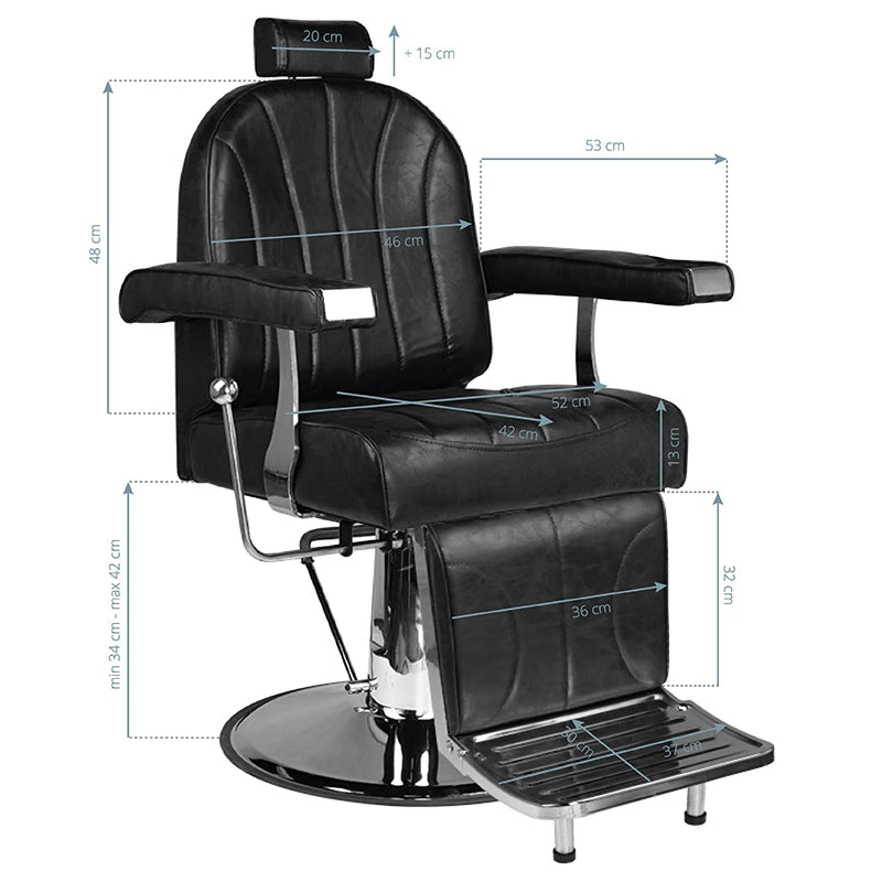 classic hairdressing chair – a barber brand by hair system. elegant and very comfortable. a solid, chrome base guarantees the stability of the seat. upholstery made of high-quality black eco-leather. the armchair has an adjustable backrest with a headrest and up and down height adjustment.