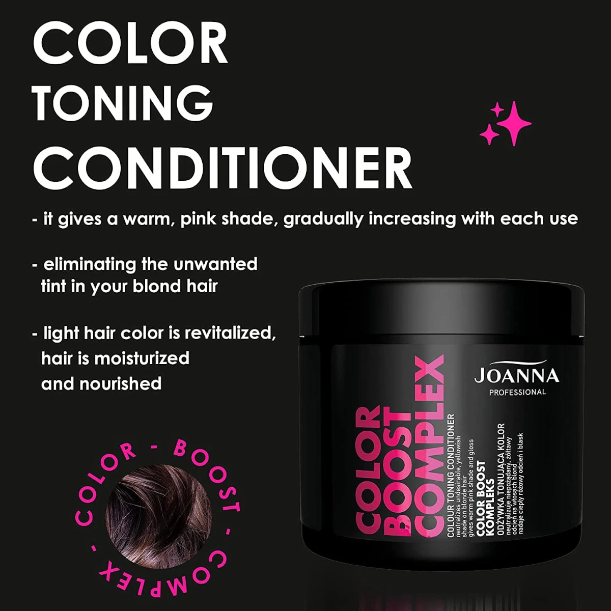 Joanna Professional Color Boost Complex Colour Toning Conditioner is specially developed for salon use to neutralize yellowing shades from bleaching and dyeing perfectly. Its nourishing and moisturizing ingredients help condition your hair, giving it a warm, pink reflex and radiant glow. Microproteins nourish and invigorate the hair, leaving it feeling light and silky to the touch.