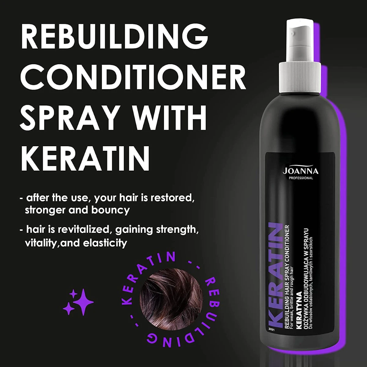 Rebuilding Keratin Hair Spray Conditioner from Joanna Professional is a powerful conditioner specially formulated to restore weakened, brittle, desiccated hair’s strength, shine and vibrancy. Infused with keratin, this intensely stimulating formula helps to replenish vital nutrients, leaving locks feeling and looking healthy, smooth and shiny.