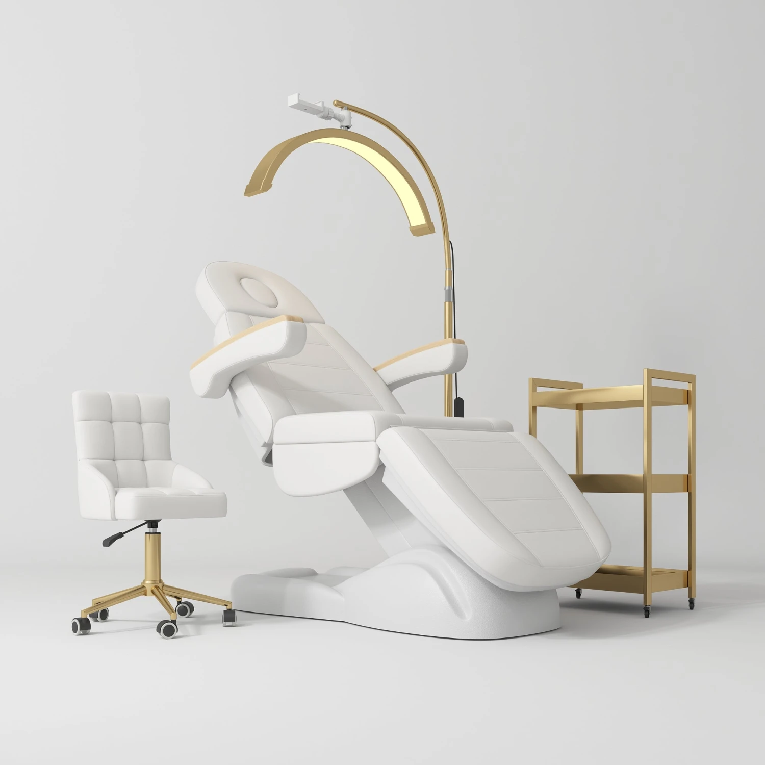 The Manufakturo Grace Electric Beauty Bed is a masterpiece of design and utility, featuring three motors for easy adjustment and a solid wood frame for unbeatable durability. Complementing this is the Noblesse Beauty Chair, which marries Art Deco elegance with modern functionality, offering a comfortable seating experience with a pneumatic lifting system and 360-degree swivel. The Beauty Lash LED Moonlight revolutionises workspace lighting with its adjustable colour temperature and brightness, ensuring every detail is visible and eliminating harsh shadows. Finally, the Beauty Trolley Assistant offers ample storage and mobility, keeping your tools organised and within reach with its three-tier design. Together, this salon set not only meets but exceeds the expectations of busy beauty professionals.