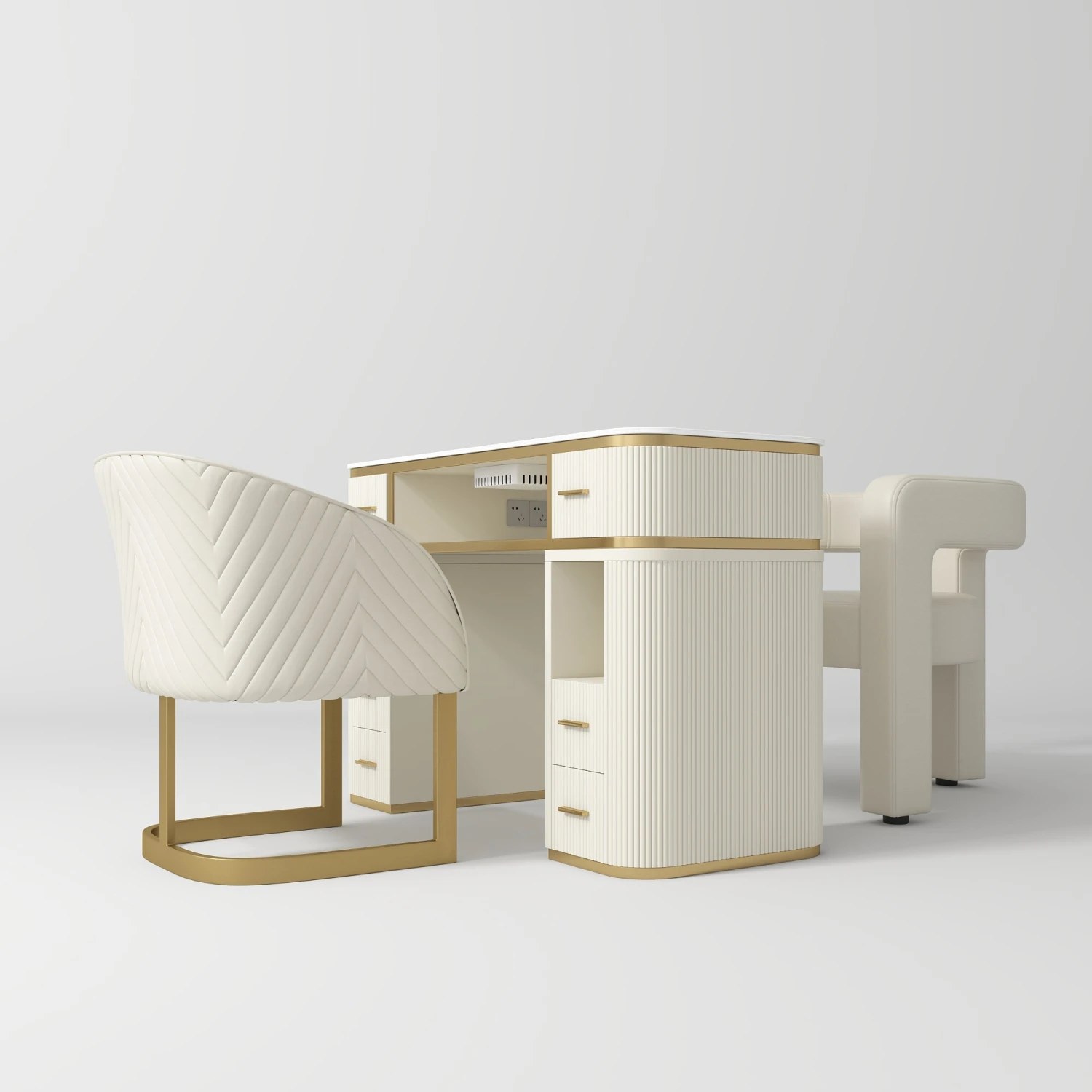 The built-in dust absorber is a standout feature, ensuring a clean and pleasant environment, making the manicure experience more enjoyable for both client and technician. Constructed from solid wood multilayer board, this table promises lasting durability and stability. Accompanying this stylish table are two chairs, each designed with comfort and elegance in mind. One chair features a stainless steel base, while the other boasts a solid wood frame, both with high-density sponge and leather finish, perfect for providing ultimate comfort for your clients.