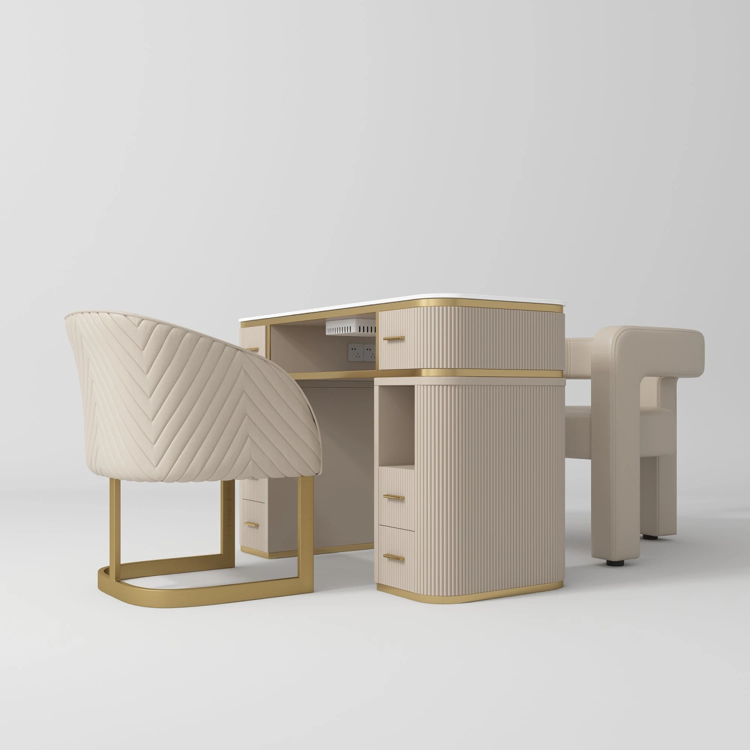 The built-in dust absorber is a standout feature, ensuring a clean and pleasant environment, making the manicure experience more enjoyable for both client and technician. Constructed from solid wood multilayer board, this table promises lasting durability and stability. Accompanying this stylish table are two chairs, each designed with comfort and elegance in mind. One chair features a stainless steel base, while the other boasts a solid wood frame, both with high-density sponge and leather finish, perfect for providing ultimate comfort for your clients.