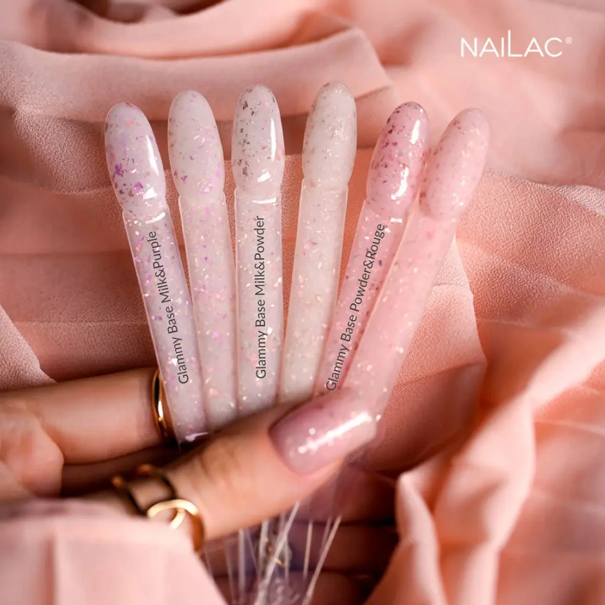 Discover the novelty from Nailac Glammy Base – elegance, delicacy, brilliance. The new collection of Glammy Base rubber bases will create extremely chic stylizations on your nails in just a few moments! They will cover with a milky or colored, opaque shade and add a feminine style with irregular particles of cut foil. One layer of base and top is enough.