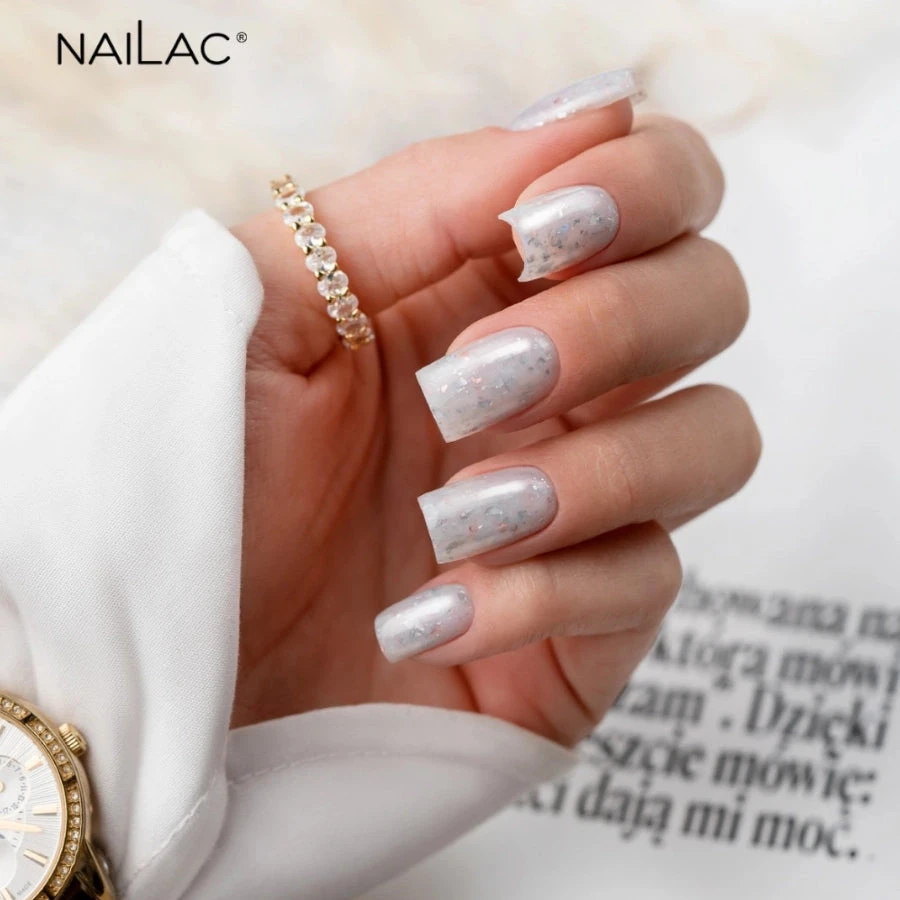 Discover the novelty from Nailac Glammy Base – elegance, delicacy, brilliance. The new collection of Glammy Base rubber bases will create extremely chic stylizations on your nails in just a few moments! They will cover with a milky or colored, opaque shade and add a feminine style with irregular particles of cut foil. One layer of base and top is enough.