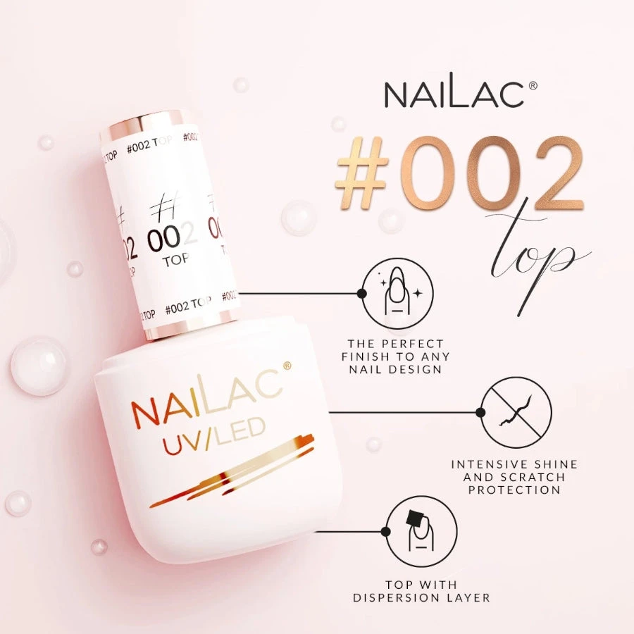Shiny hybrid top # 002 from Nailac gives hybrid nail polishes an intense shine and protects against scratches and mechanical damage.