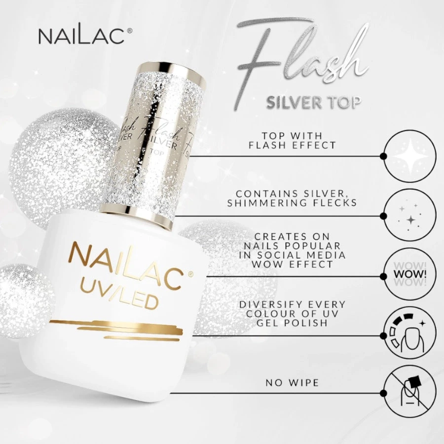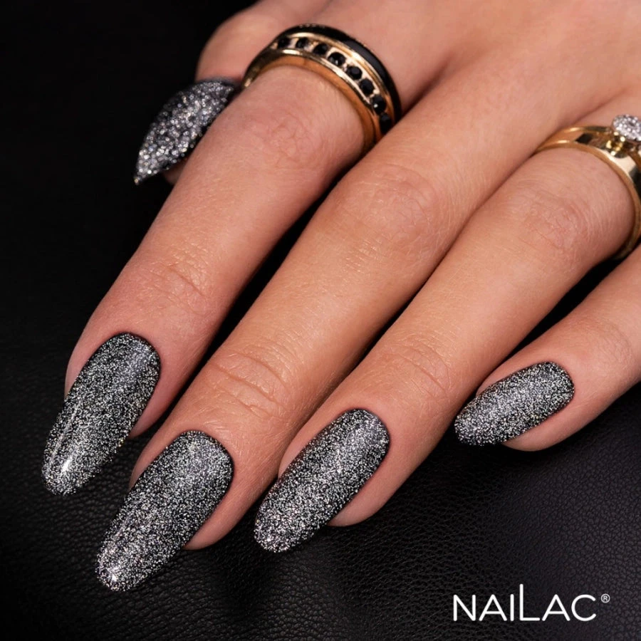 Flash Silver hybrid top is a shiny top from Nailac that does not require rinsing. It is transparent, in which millions of shimmering silver particles have been embedded, which, depending on the intensity of the incident light, shimmer more and more and surprise with a spectacular glow. It can be applied to any color of nail polish to get the effect popular among nail influencers with literally any hybrid. With such #mani, however, you will conquer not only the virtual world. You will delight with a shiny finish that no one will pass by indifferently!