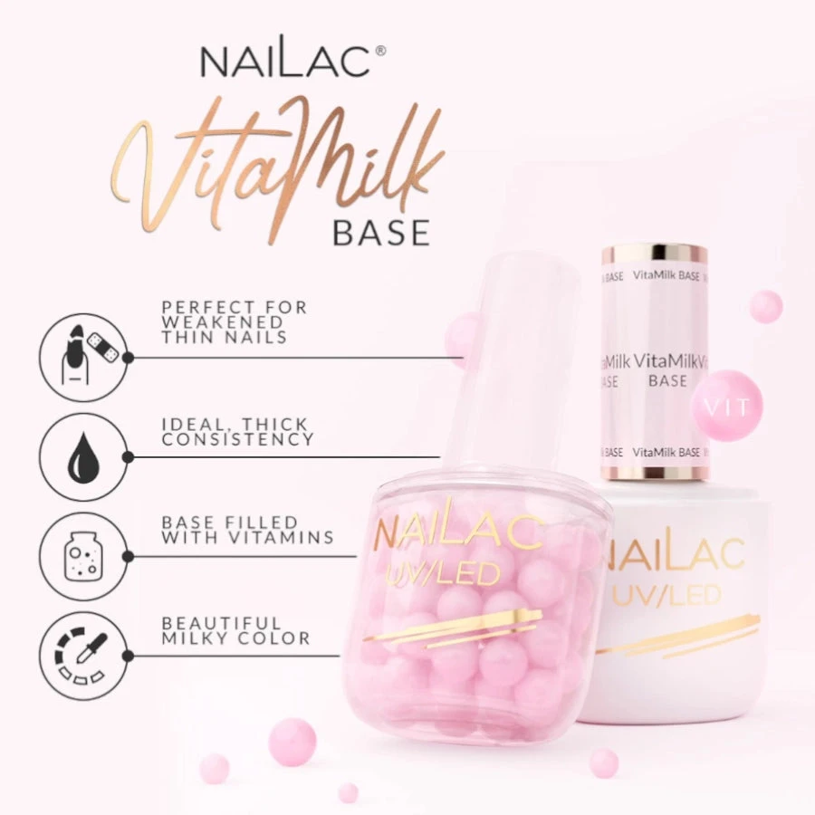VitaMilk Base by Nailac is a building, vitamin-filled base that is a breakthrough in styling and strengthening nails. Its perfect, dense consistency makes it perfectly level without flooding the cuticles and allows easy superstructure and filling in the unevenness of the plate. The vitamins contained in the base strengthen weakened and thin nails, and its high elasticity ensures safety in mechanical injuries. A beautiful, slightly milky shade will be perfect as an independent color or will beautifully highlight pastel shades.