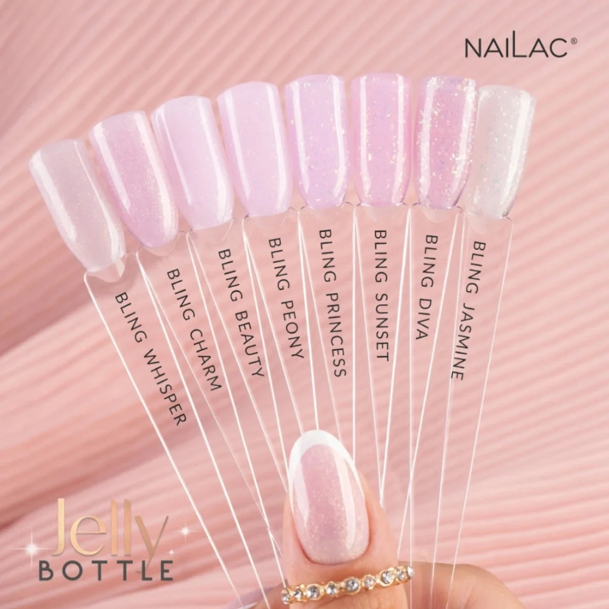 Jelly Bottle by Nailac in the shade Bling Jasmine is a milky shade with opalescent particles. Bling Jasmine will cover your nails with multidimensional shine. Created for styles that are to delight with subtlety.