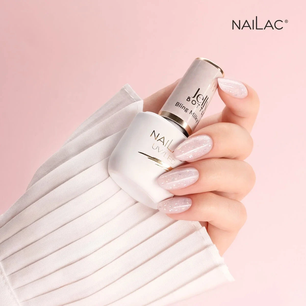 Jelly Bottle by Nailac in the shade Bling Milky Way is a milky white gel in a bottle with particles of irregular pieces of multi-colored, holographic foil.