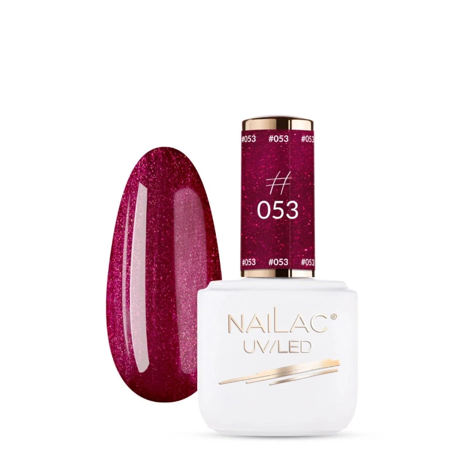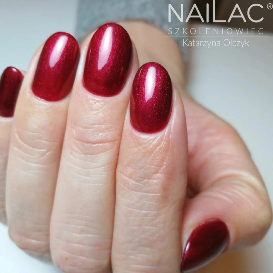 Nailac hybrid polish, color #053, cherry-colored, subtly illuminated with cherry particles. The shade #053 is autumn elegance, which is often associated with shades of burgundy and cherry, and if we add millions of shiny particles – it will be not only elegant, but also effective.