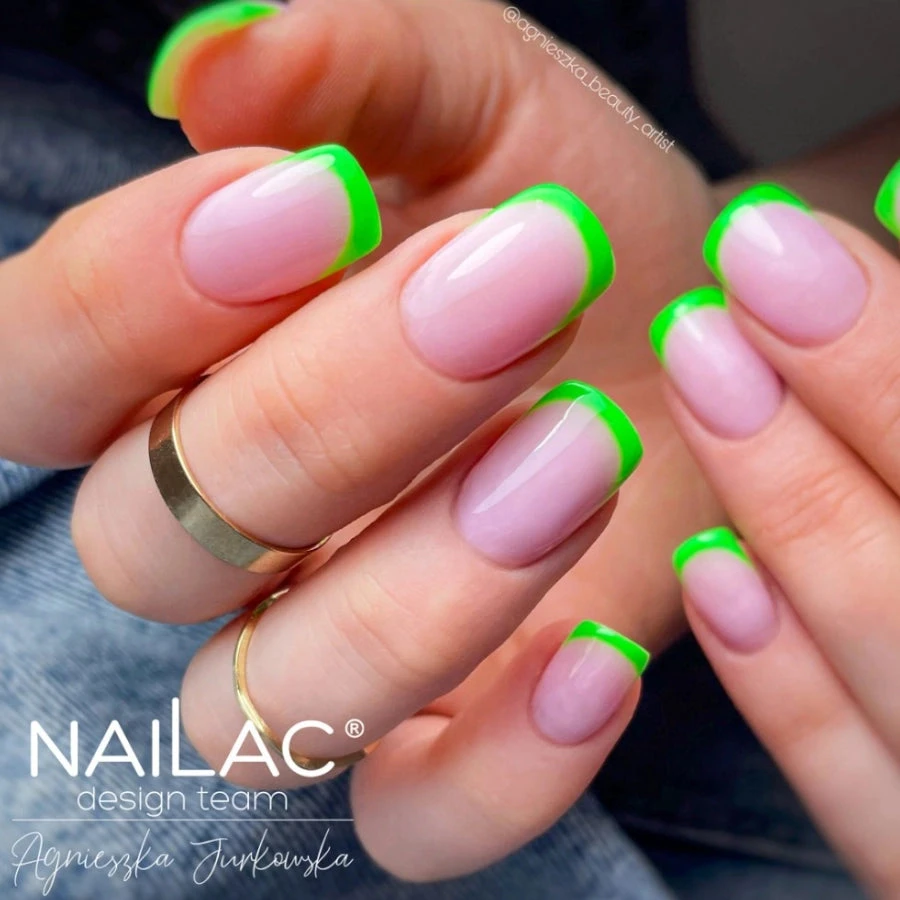 Nailac hybrid polish in colour #235N is a green neon shade. Color #235N is neon lime. A luminous and vivid shade of fresh grass, which, bathed in the rays of the summer sun, tempts with its color and evokes holiday joy.