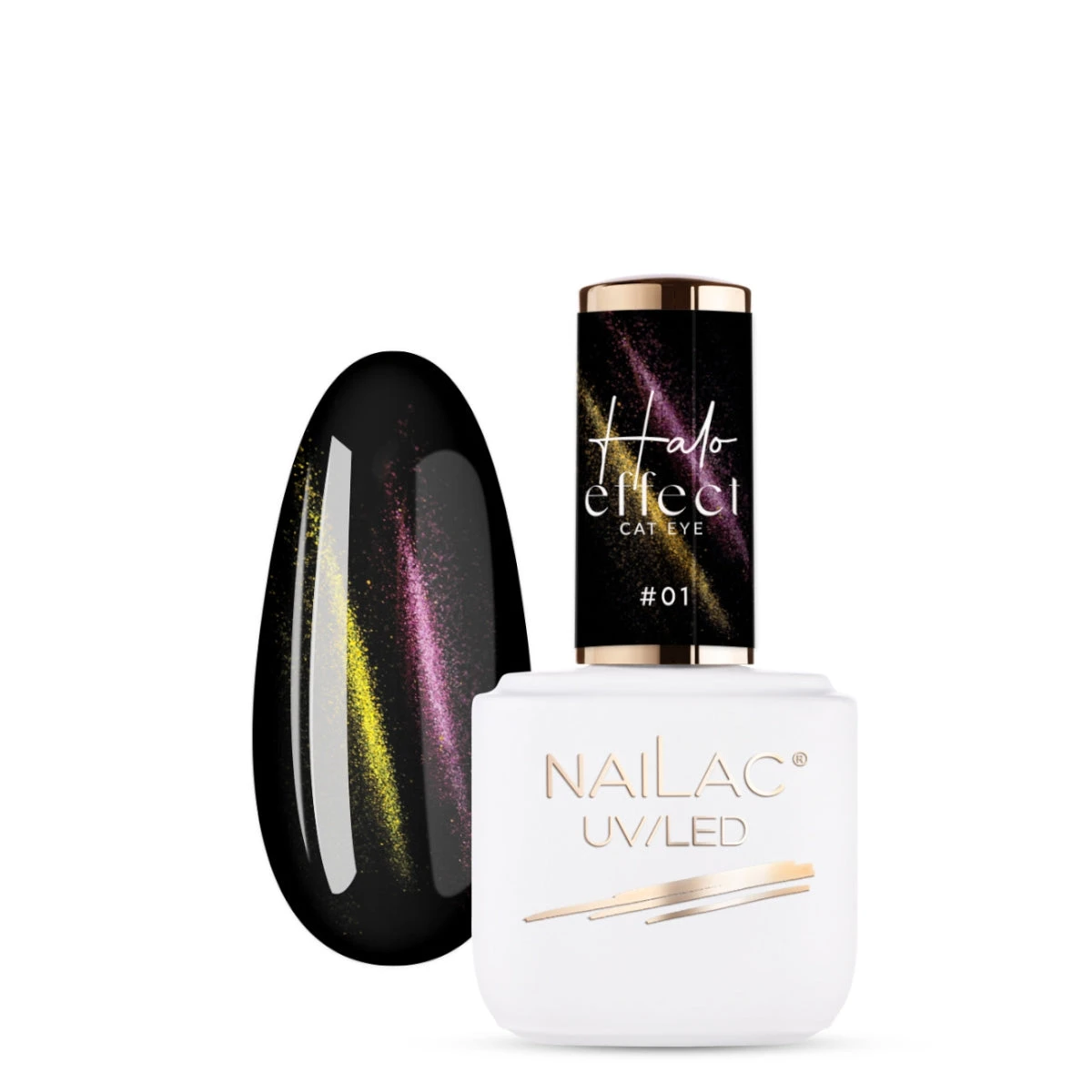 The colour of hybrid nail polish 01 from the Cat Eye collection by Nailac is a colourful magnetic hybrid nail polish, Halo Effect. Create a manicure with thousands of multicoloured particles that will never look the same. From gold, through pink to orange with emerald reflections – this is how the colour of your nails will change depending on the angle of light and the movements of your hand. Choose a magnetic hybrid varnish and mesmerize with its metallic styling with a cat’s eye effect.