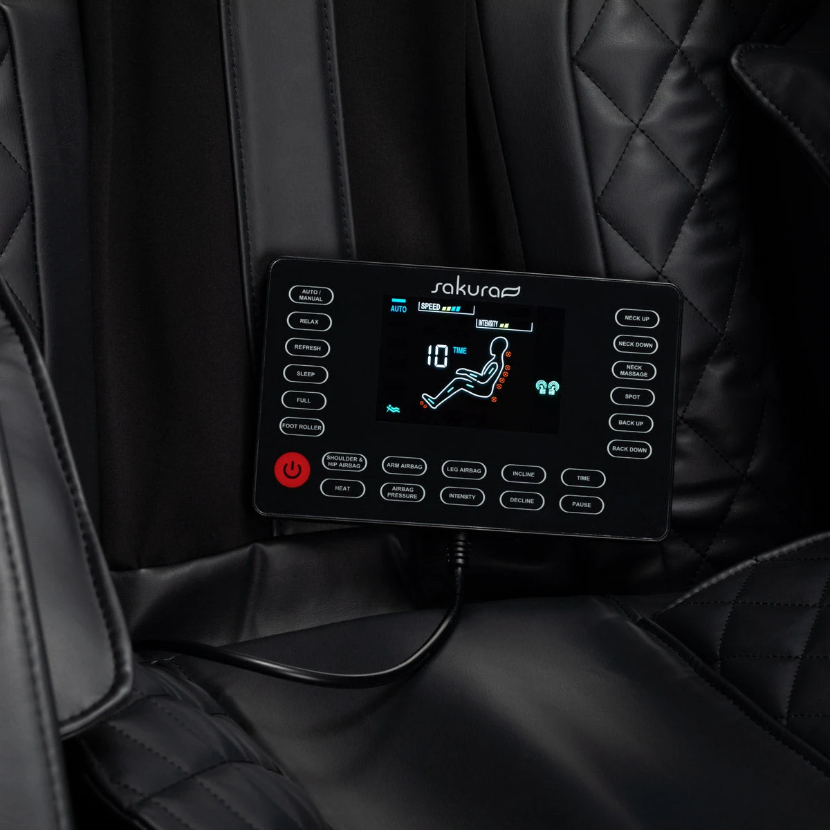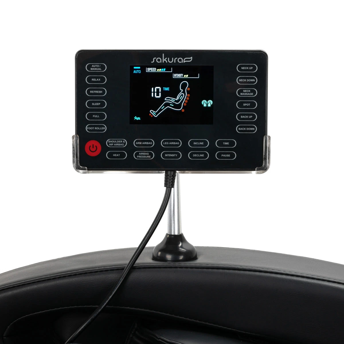 The easy-to-read control panel makes using the chair easy and pleasant. For greater convenience, it can be placed on a handle mounted on the right armrest or held in the hands. The operation of the device can be monitored on a clear LCD screen; the areas of the body where the massage is being performed at a given moment, its intensity, treatment time and the selected program are clearly displayed. The panel allows you to select the massage program, freely adjust the settings of the chair and massage functions, adjust the intensity, and set the duration of the treatment, which can last 15, 20, 25 or 30 minutes.
