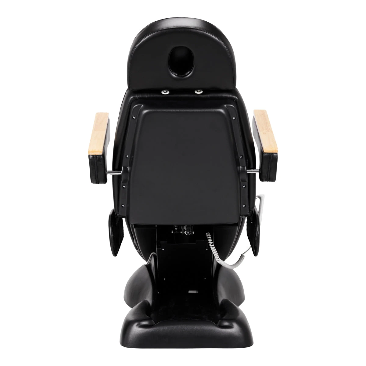 The chair is filled with foam of appropriate hardness and covered with pleasant-to-the-touch imitation leather in shades of black. Thanks to the use of a material that is easy to keep clean and resistant to selected disinfectants, the equipment is comfortable to use, resistant to moisture and easy to clean. A solid base made of durable material in shades of black ensures stability during treatments. Decorative wooden elements on the armrests distinguish the chair from other models, being a visually appealing, elegant accent. Properly profiled hems give the chair a stylish look and make the seat ergonomic.