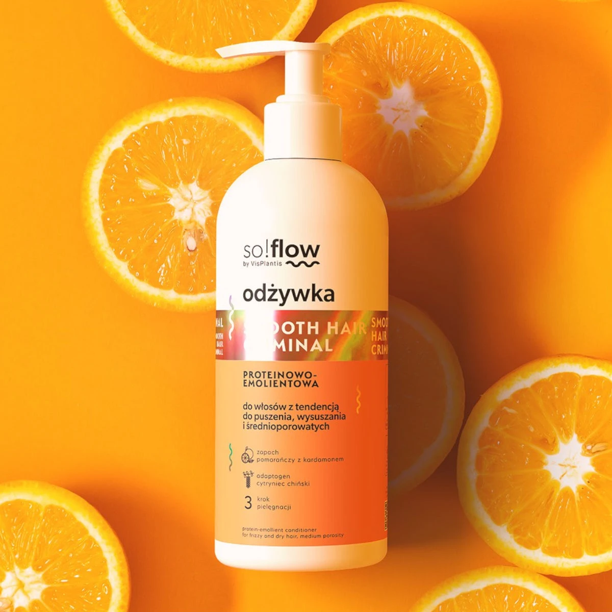 Protein-emollient conditioner from So!flow is dedicated to hair with a tendency to frizz and dryness. Hair with a tendency to frizz, dryness and medium porosity is often weakened, lacks shine, reacts with frizz to excess moisture and shows a tendency to curl. Proper care will help it regain smoothness, softness and shine, making the hair silky to the touch, easy to comb and full of elasticity.