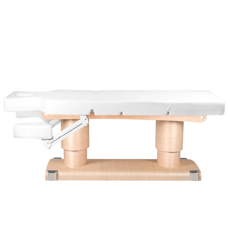 electric cosmetic bed adjustable in height in a very wide range from 64 to 82 cm. backrest, footrests also adjustable by remote control, face opening, support columns controlled independently. a wide piece of furniture (76 cm), with a thick and very comfortable and heated mattress. the bunk is very stable. it is upholstered with high-quality eco-leather in a delicate ecru shade.