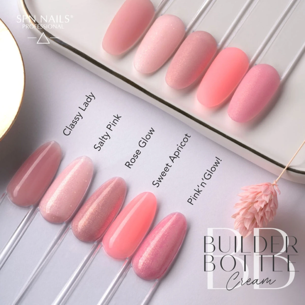 Builder Bottle Cream in Rose Glow is a classic, pastel “cover” shade with the addition of tiny gold sparkles. It looks beautiful alone and with French manicure.