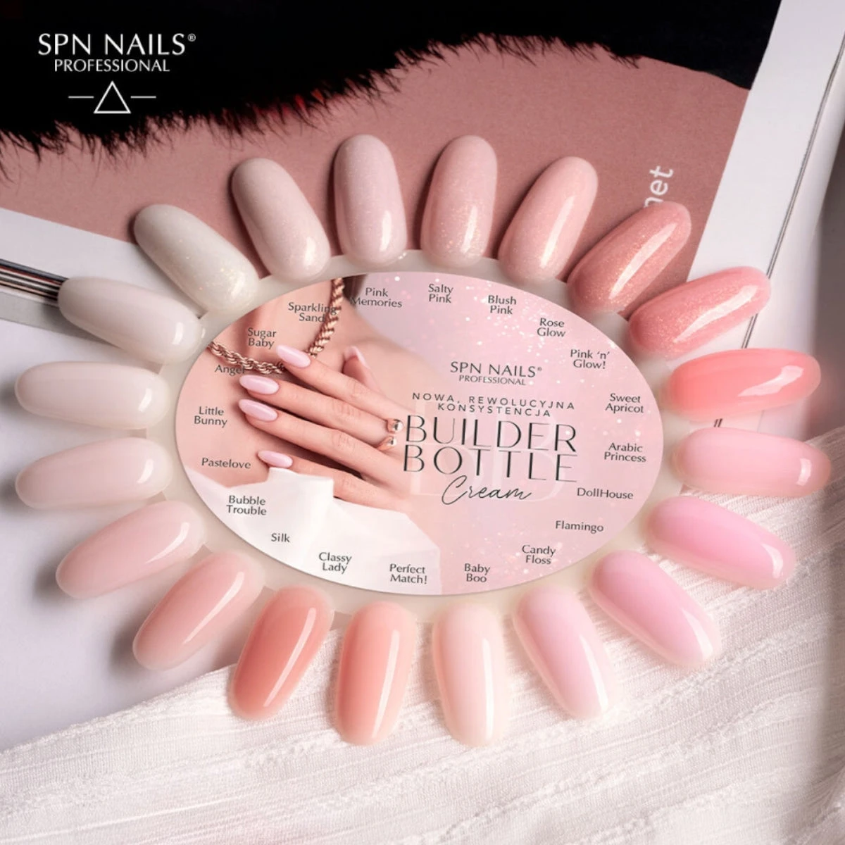 Builder Bottle Cream in Salty Pink is a pastel, milky shade of pink and a combination of peach-coloured iridescent particles with a million gold-iridescent sparkles. A cheerful, elegant, beautiful colour in a warm shade.