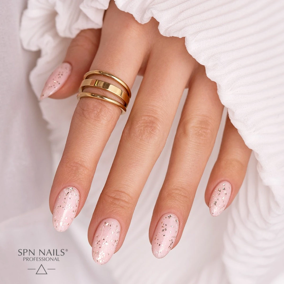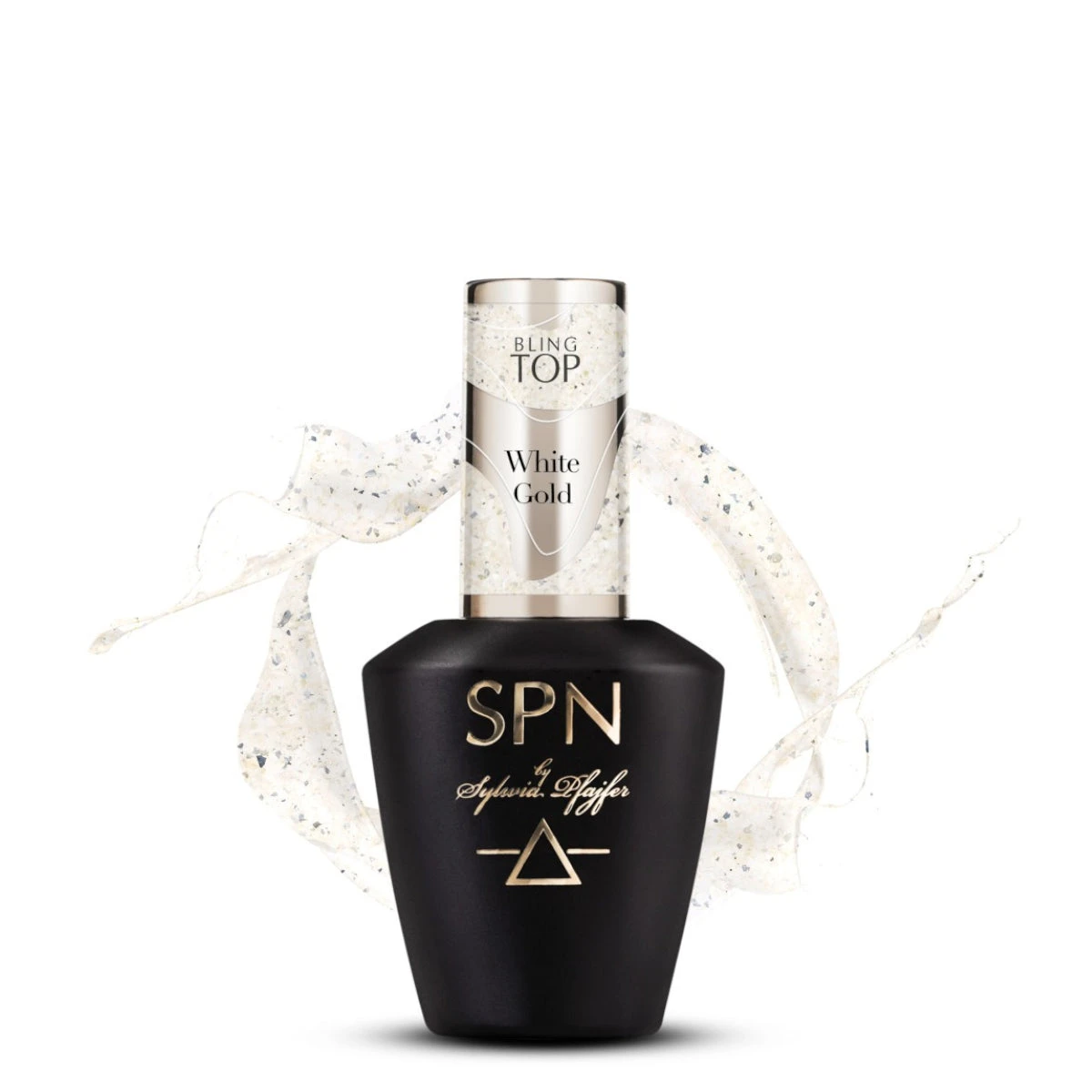 Bling TOP from SPN Nails in the shade of White Gold is a transparent hybrid top with shiny particles of various sizes and small pieces of cut foil in the shade of white gold embedded in it.