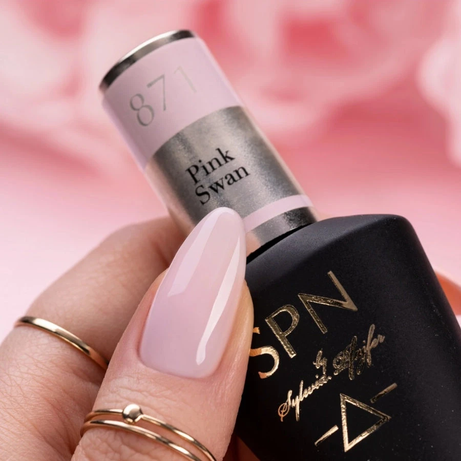 SPN Nails hybrid polish in 871 Pink Swan color is a semi-transparent nude hybrid polish from the PrimaBalerina collection. Delicate pink with a drop of whitened lavender, subtlety and grace like from the Tchaikovsky ballet.