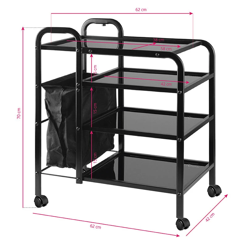 Assistant Pro Ink 1031 is a functional metal and glass assistant on rubber wheels, which has four glass shelves. an additional advantage is the attached bag for dirty towels and bands, etc. it has a lamp holder.Â