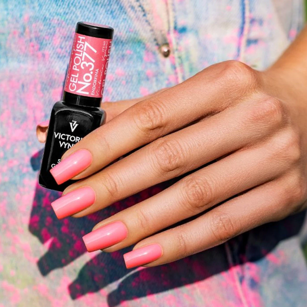 Gel Polish Hybrid 377 Endorfina by Victoria Vynn from the Dopamine collection. Gel Polish Color to be used with hybrid and soak-off systems. An extremely charming shade of red pearl illuminated with a subtle particle. The magical glow of this styling will enchant everyone. Fits many styles. Range of over 200 colours from classics, glitters, pastels, neons and semi-transparent. Two thin layers provide ideal coverage and colour depth, medium thick consistency, and don’t drip, even when applied with a flat brush.