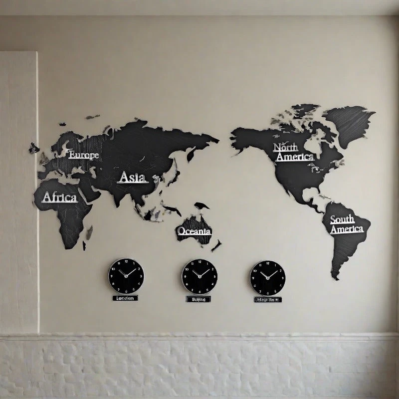 Add a touch of elegance and functionality to your space with our World Map Decoration Clock – Time Zones. This unique piece features an extremely effective map of the world combined with three wall clocks, allowing you to easily keep track of time in different time zones. Whether you’re a jet-setter or simply appreciate practical decorative accessories, this map clock is a must-have for your room.